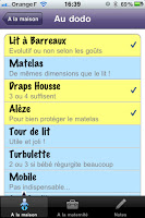 Mais il y a aussi des listes de choses à prévoir pour le retour à la maison. Là aussi, c’est classé par catégories : à table, au dodo, au bain, dans mon armoire, pour jouer, et en balade/voyage. C’est idéal pour une jeune maman qui est un peu perdue au milieu de l’immense offre de matériel de puériculture (il y a des indications sur ce qui est indispensable ou pas), et puis ça permet de vérifier qu’on a rien oublié, y compris lorsqu’on part en vacances !