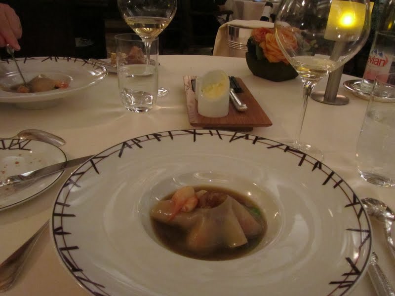 – en entrée, un bouillon gourmand de queues d’écrevisses et raviole de foie gras