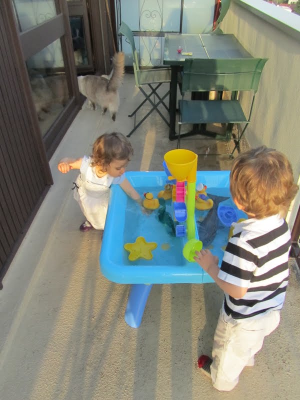 Et oui chère lectrice, sache que Poupinette et Choupi n’ont pas péri cramés sous le soleil de plomb aujourd’hui. Nous sommes des parents super sympas alors on a sorti la fameuse « table sable et eau » dont je t’avais parlé ici, sauf que nous, on n’y a mis que de l’eau !